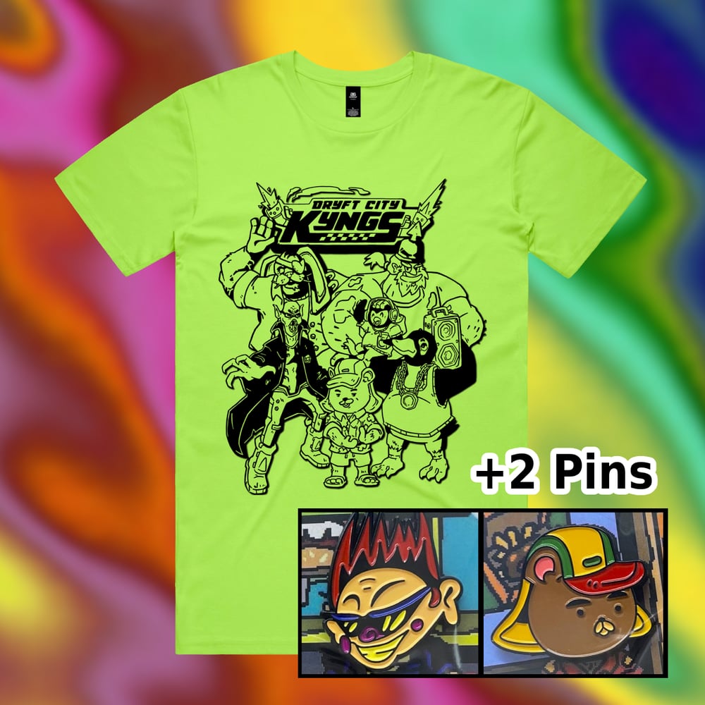 Be visible while dryfting through the grey concrete of the City with the Official Dryft City Kyngs Citrus Shirt, featuring an ensemble of your favourite characters: Lozzy, Big Lemoo, DJ Puke, Deadsting D.V.V., Inky, and Baby Blackjuice!